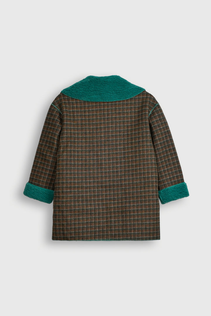 The coat combines earthy brown tones with vibrant teal accents, creating a stylish and charming outerwear piece perfect for autumn or winter