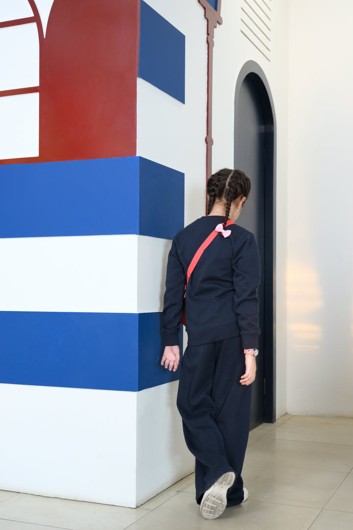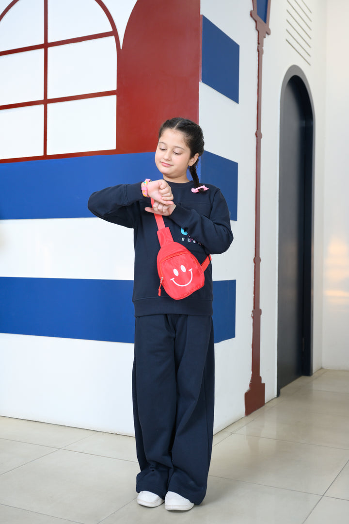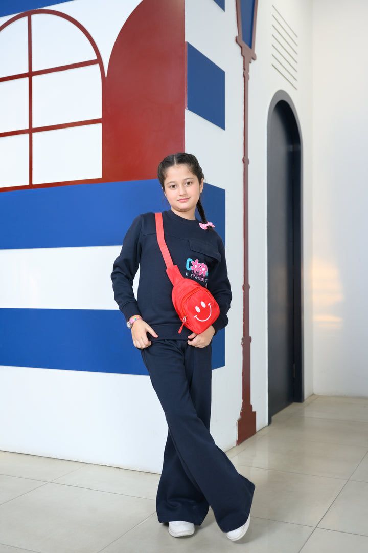 Two-piece fleece set that includes a navy blue sweatshirt and matching pants — both made from a cozy fleece fabric.