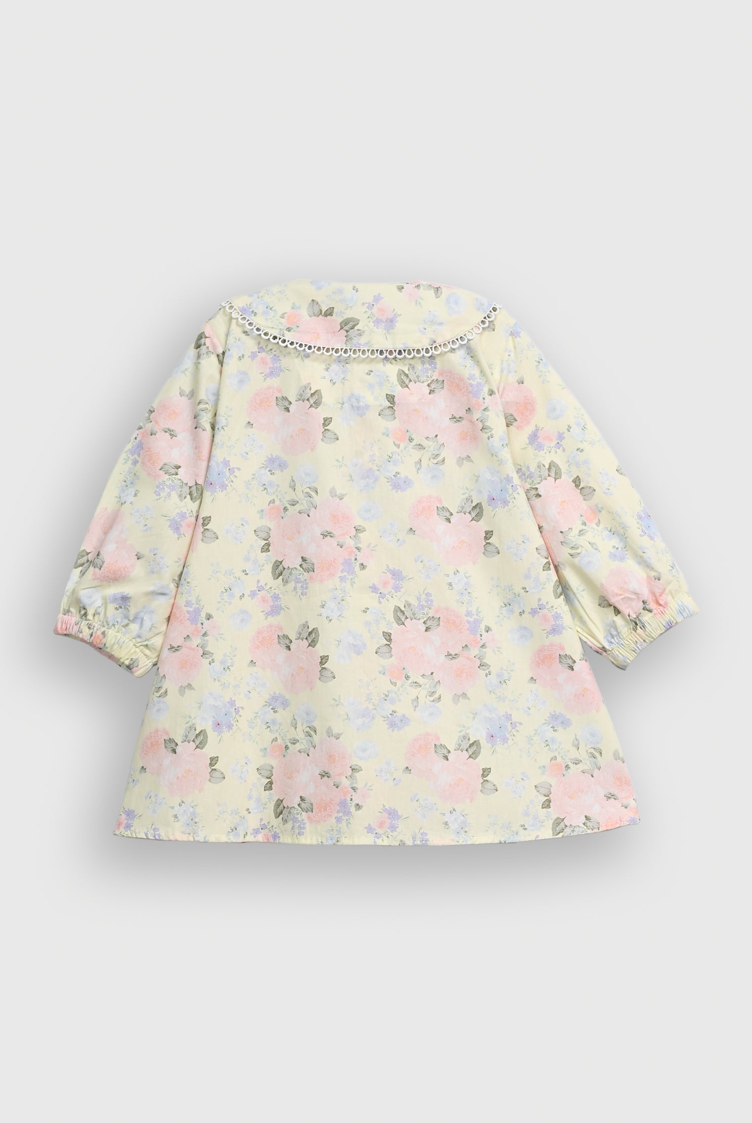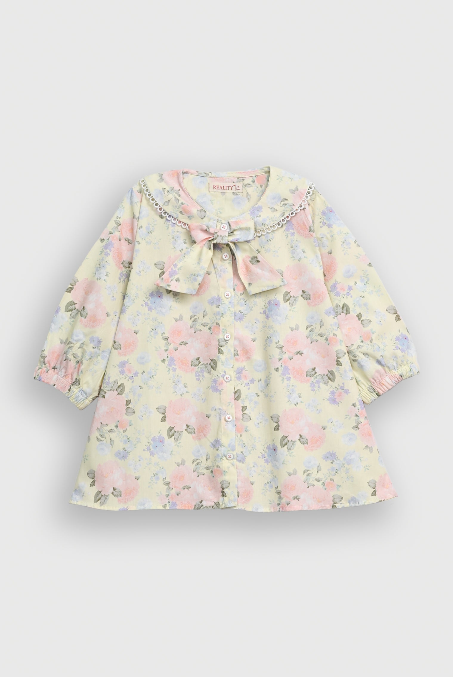 Elegant girls 2-piece outfit crafted from 100% premium cotton for a soft, breathable, and comfortable feel. The set includes a long-sleeve button-down top with a stylish bow tie neckline and decorative lace-trim collar, adding a charming and delicate touch. The matching elastic-waist trousers ensure a comfortable and flexible fit for everyday wear. The outfit features a beautiful all-over floral print, making it perfect for casual outings, seasonal wear, and special occasions.