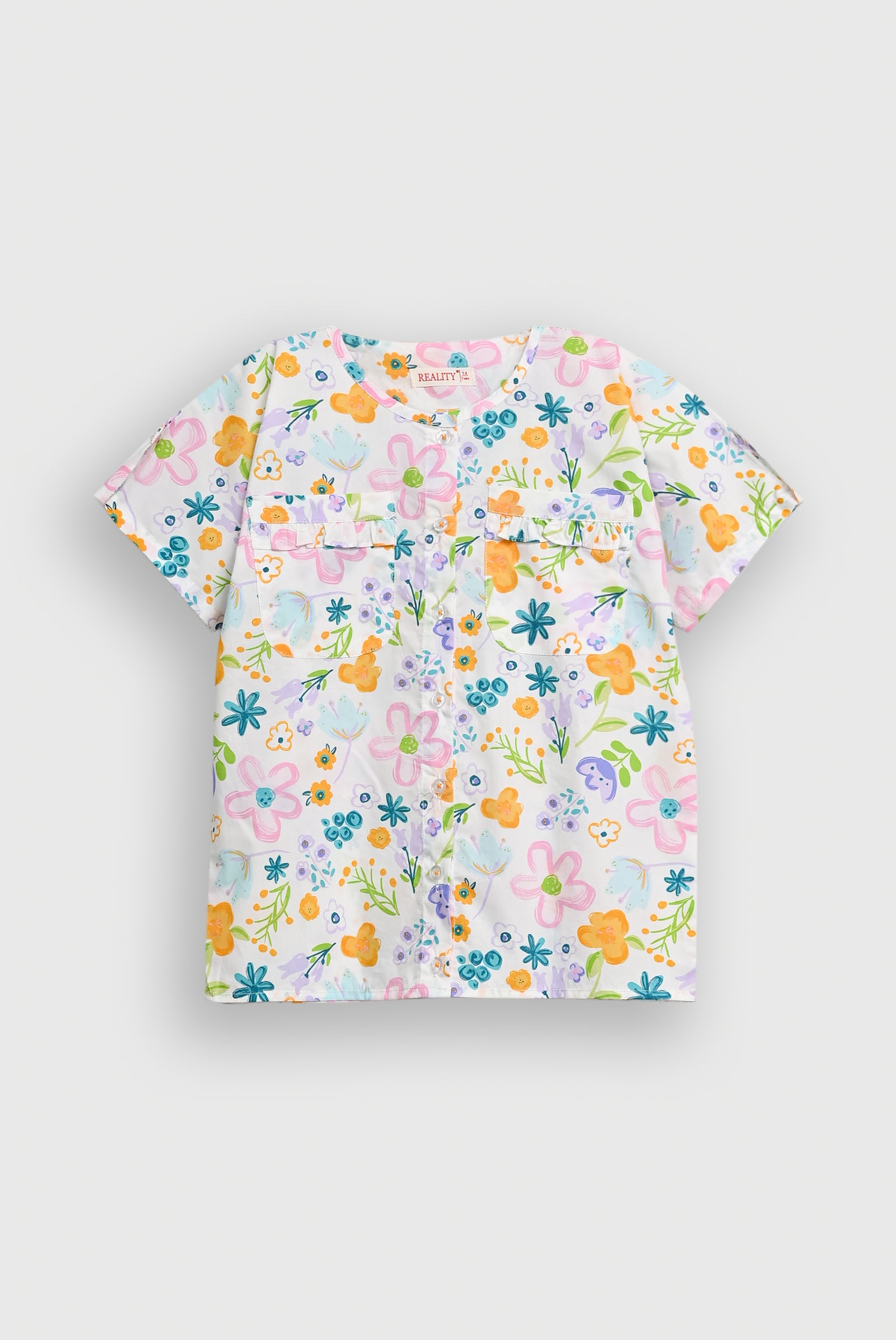 Beautiful girls 2-piece outfit made from 100% premium cotton, offering a soft, breathable, and comfortable feel for everyday wear. The set includes a short-sleeve button-down top with a round neckline and stylish front pocket flaps, adding a trendy and playful touch. The matching elastic-waist trousers provide a relaxed and flexible fit for all-day comfort. The outfit features a vibrant all-over floral print, perfect for casual outings, summer wear, and fun daily styling.